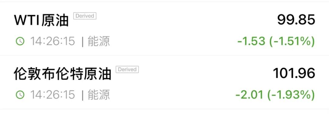 国际油价持续下跌,截至发稿,WTI原油失守100美元/桶,日内跌1.51%;布伦特原油日内跌近2%。
