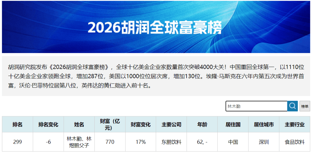 2026年3月5日,胡润研究院发布《2026胡润全球富豪榜》,林木勤、林煜鹏父子以770亿排名第299位;而在2025年10月28日,胡润百富发布的《2025年胡润百富榜》上,林木勤、林煜鹏父子当时的财富值是910亿元,短短4个多月,财富值缩水140亿元。