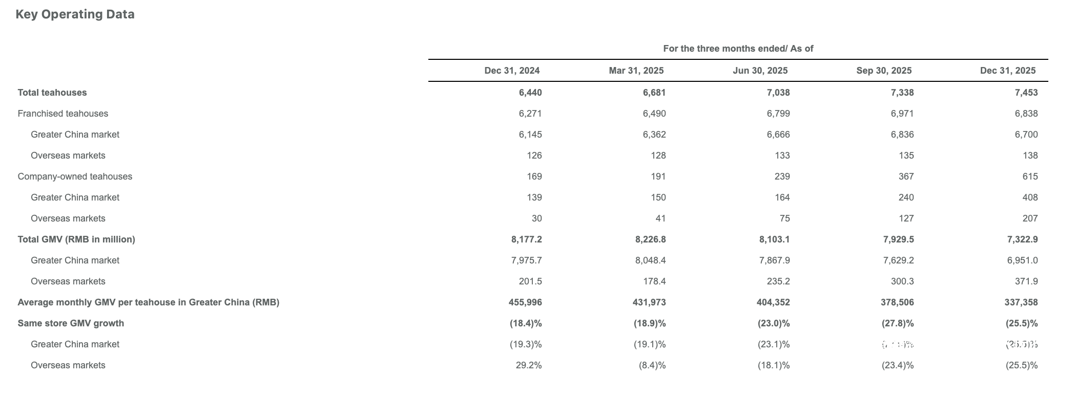 在同店销售额方面,2025年各季度霸王茶姬均录得负增长,其中,2025年第四季度,霸王茶姬国内门店同店销售额下降25.5%,海外门店也下降25.5%。
