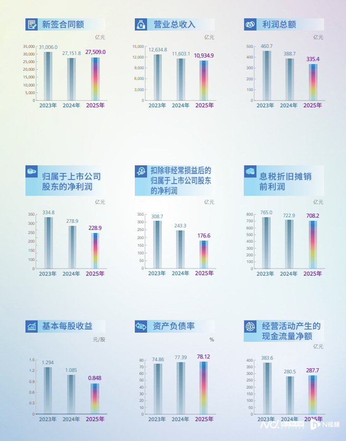 在2025年新签合同中,其中境内业务实现新签合同额24935.3亿元,同比降低0.03%;境外业务实现新签合同额2573.7亿元,同比增长16.5%。