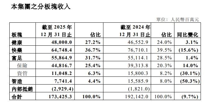 复星国际的主要业务分为健康、快乐、富足、智造四大板块,涵盖四大核心企业——复星医药、豫园股份、复星葡萄牙保险和复星旅文。2025年,四大核心企业总收入达到1282.4亿元,占总收入比重达到74%,剔除豫园股份影响,收入同比上升3%。