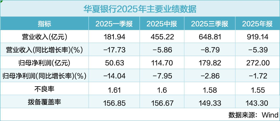 年报数据显示,该行归母净利润同比降幅从2025年一季度的14.04%逐季收窄至上半年的7.95%,全年最终收窄至1.72%。营收同比降幅也从去年一季度的17.73%收窄至全年的5.39%。且在第四季度单季,华夏银行营收同比增长3.9%,归母净利润同比增长0.6%,增速双双转正。