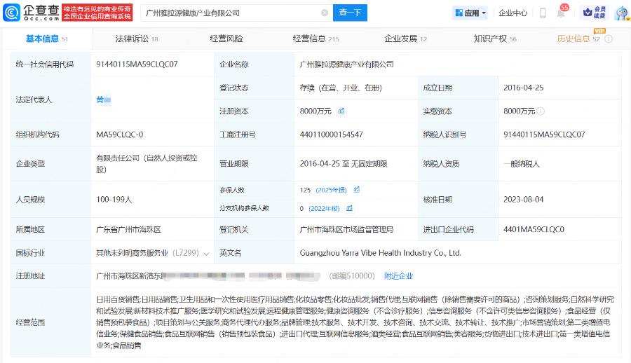 企查查显示,优思益的关联公司为广州雅拉源健康产业有限公司,法定代表人为黄某,公司成立于2016年4月,注册资本8000万元,背后股东为两名自然人,经营范围涵盖日用百货、化妆品、预包装食品、保健食品、货物及技术进出口、品牌管理、健康咨询、互联网销售等多项业务。
