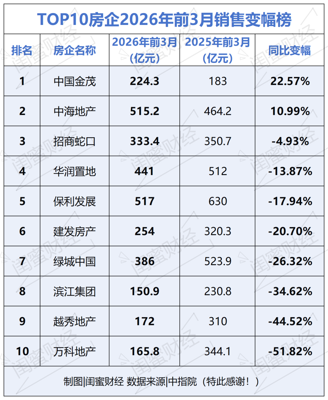 按照惯例,蜜妹统计了10强房企的销售额变幅情况,具体如下表:其中有2家房企前3月销售额同比是上涨的,比前2月多了一家。分别是中国金茂同比增长22.57%,中海地产同比增长10.99%。