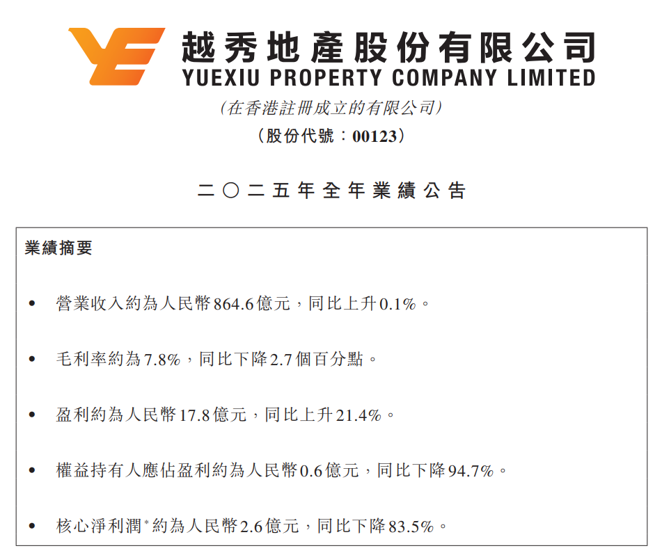 另外越秀地产的2025年也是有点“疼”,营业收入864.6亿元,同比微增0.1%;但归母净利润0.6亿元,同比大跌94.7%;核心净利润2.6亿元,同比跌83.5%;毛利率仅7.8%,同比下降2.7个百分点。