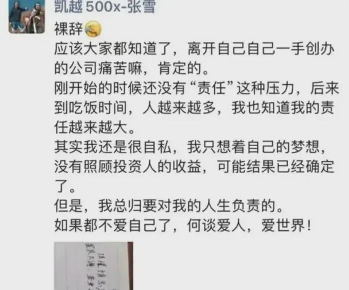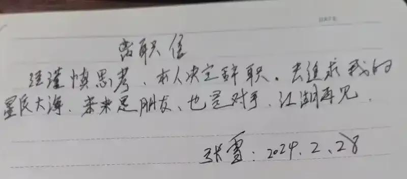 2024年2月28日,张雪递交了手写的辞职信,自己把自己从自己创立的公司里开除了。