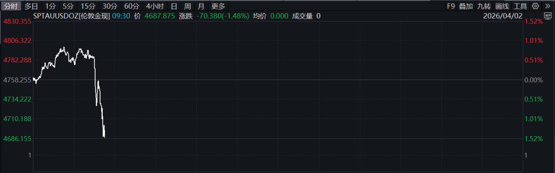 贵金属板块集体低开,晓程科技低开近4%,西部黄金、湖南白银均低开超1%。消息面上,特朗普发表伊朗战争讲话后,WTI原油突破103美元/桶,日内涨4.07%。布伦特原油日内大涨4美元,报102.86美元/桶,涨幅4.06%。贵金属跳水,现货黄金跌逾1%,报4687.87美元/盎司。