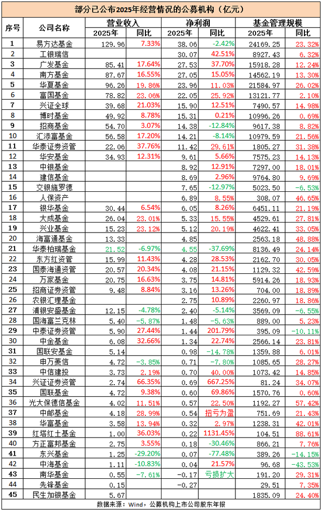 广发基金、富国基金2025年净利润分别达27.53亿元和22.05亿元,同比增幅高达37.7%与25.92%。在行业分化加剧的背景下,这两家机构以远超平均水平的增速,进一步巩固了“头部阵营”的领先地位。