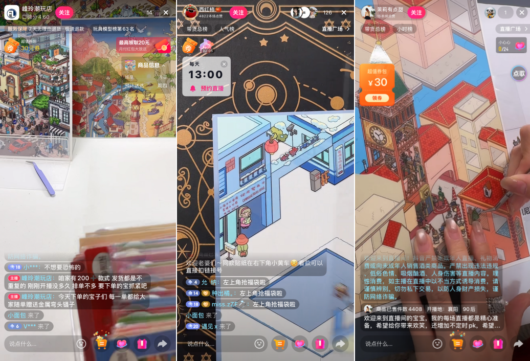 另一种则是被直播种草。主播会在直播间里一边展示自己造景贴纸的全过程,一边同步推荐售卖的商品。对观众来说,这既是一种云体验,也是一次被种草下单的过程。