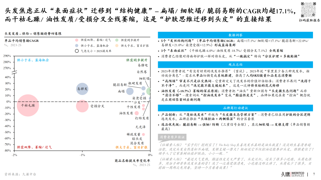 扁塌、细软塌、脆弱易断等发丝结构问题的高增长,与表面症状(如干枯毛躁)的萎缩形成了鲜明对比。如果你在2024年初就看到了这个信号,你比还在押注“蓬松”的竞品早了整整一年,这在洗发水行业意味着一个完整的新品开发周期。