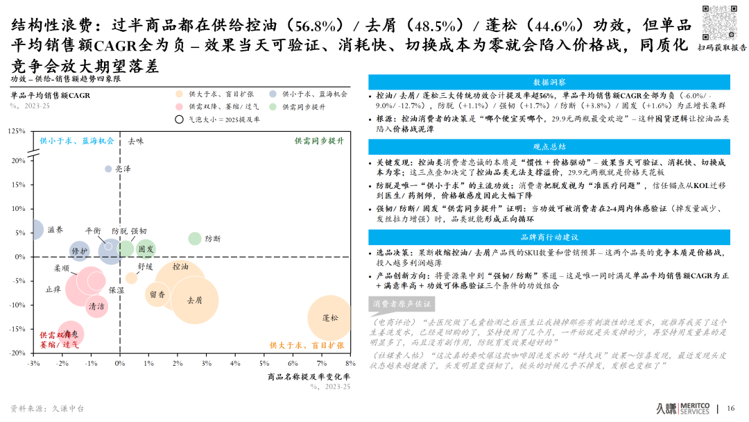 数据揭示了一个令人震惊的资源错配:行业内有超过一半的供给资源,投在了控油、去屑、蓬松这三大红海功效上,但它们的单品平均销售额复合年增长率(CAGR)全部为负!