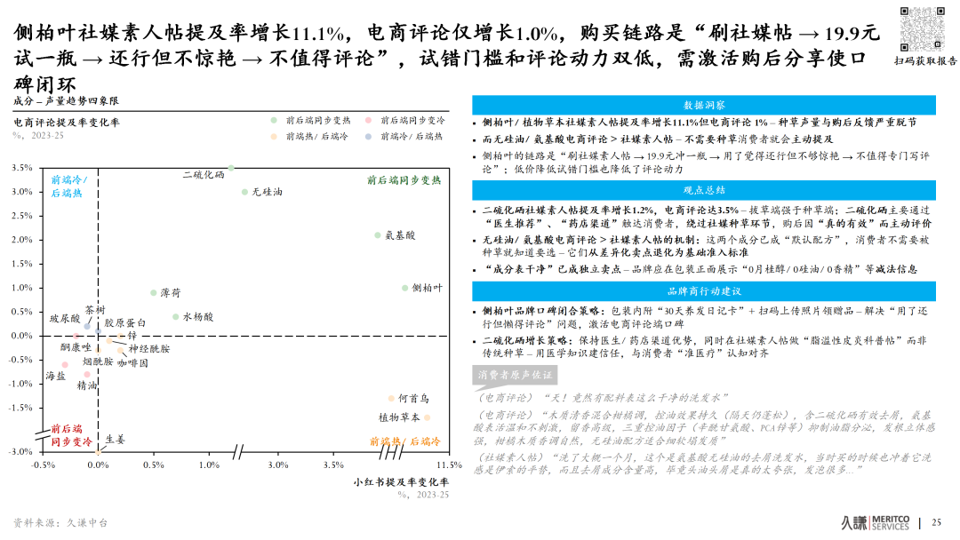 我们发现,某些成分(如侧柏叶)虽然在社媒上声量极高(提及率变化率11.1%),但在电商评论端的增长却极其微弱(仅1.0%)。