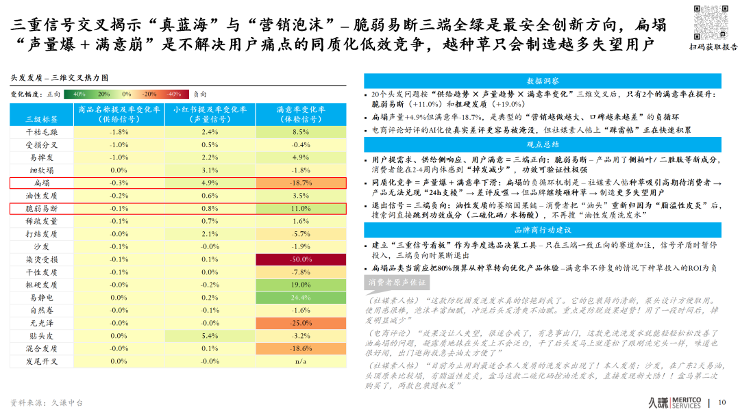 反之,如果是“两绿一红”(如扁塌:声量高但满意率暴跌-18.7%),则需要评估自身产品力是否能补齐短板 ;如果是“三红”(如油性发质→控油→海盐),那就是明确的退出信号。