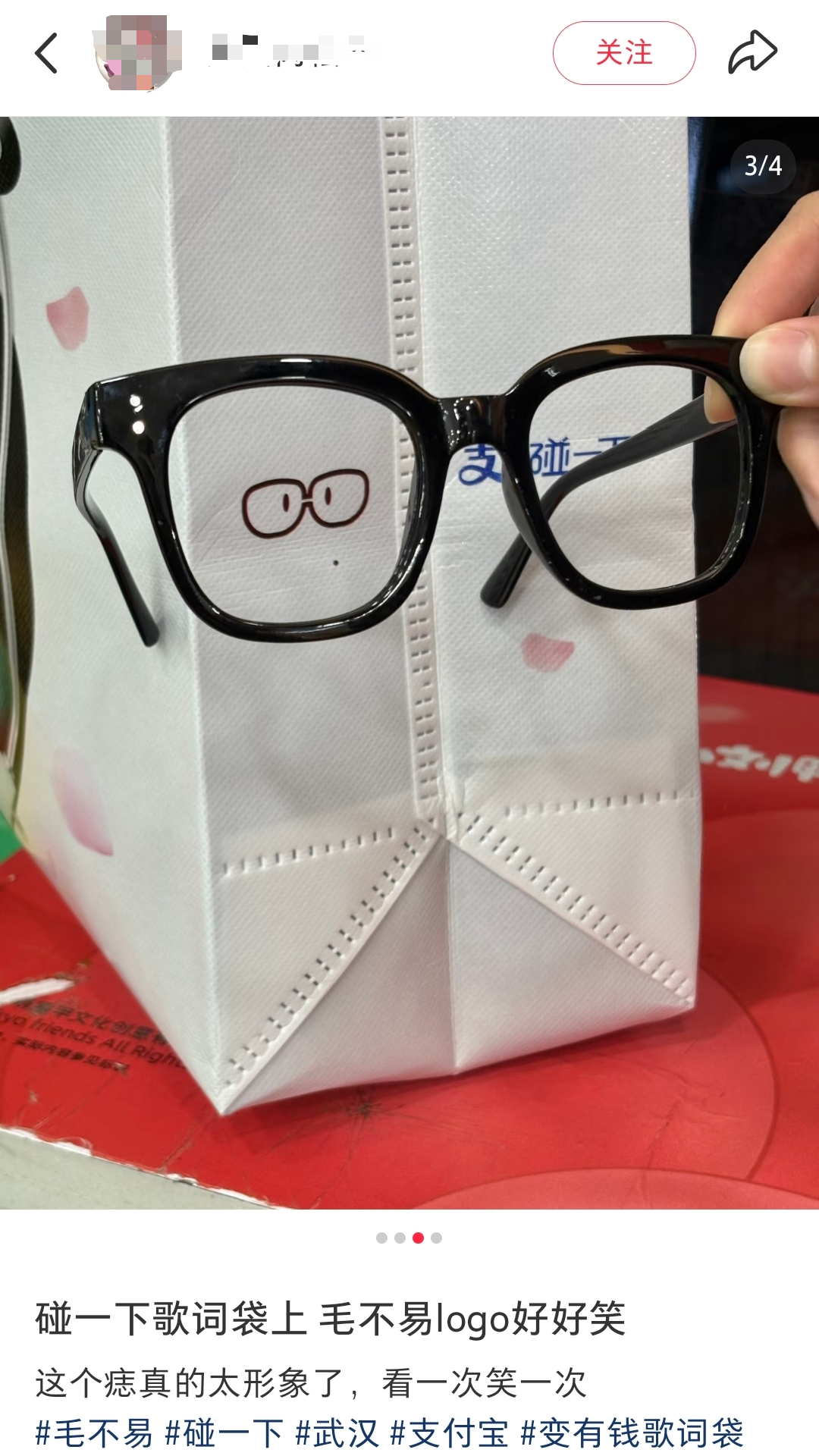购物袋上除了改编歌词,还有支付宝设计的“小巧思”,细心的网友在「碰一下」logo旁边发现毛不易logo,标志性黑框眼镜,连痣的位置都如此传神,看一次笑一次。