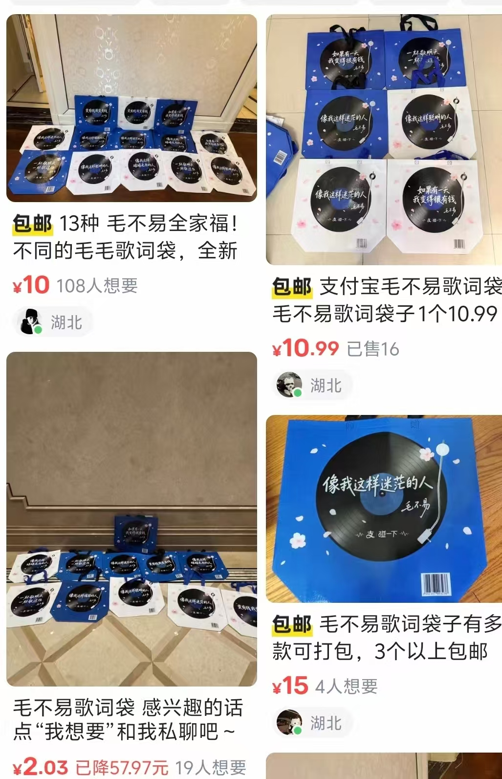 区域限定也阻挡不了想要的决心,毛不易歌词购物袋在「海鲜市场」已经成为热门单品,造福外地网友,10元包邮解锁13款歌词购物袋。