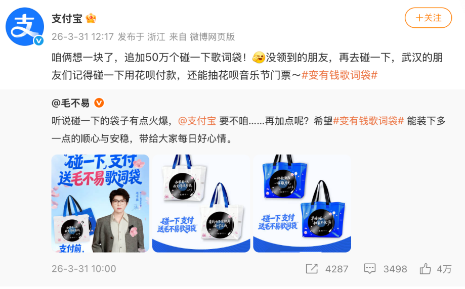 袋子不够用的消息传到了毛不易那里,3月31号毛不易发微博cue到支付宝,说要不咱们再加点。支付宝当天下场回应追加50万个碰一下歌词袋,没领到也别灰心,用花呗付款还可以试试音乐节门票抽奖。有求必应如支付宝,专出锦鲤的“知名赛博许愿池”名副其实。