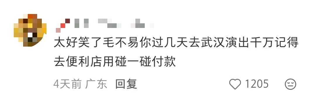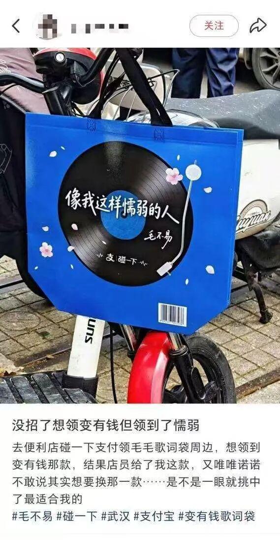 除了把歌词印在购物袋上,「碰一下」还为武汉定制了个性彩铃彩蛋,支付成功,随机解锁10个毛不易歌曲片段,用歌词袋碰一下,还能自设彩铃。虽然付款后毛不易突然开唱「有时候我感觉自己是一个巨星」有些社死,但还是想体验一下然后拍段小视频分享给网友一起吐槽。网友隔空“调戏”歌手本尊:“毛不易过几天你去武汉演出记得去便利店用碰一下支付”。