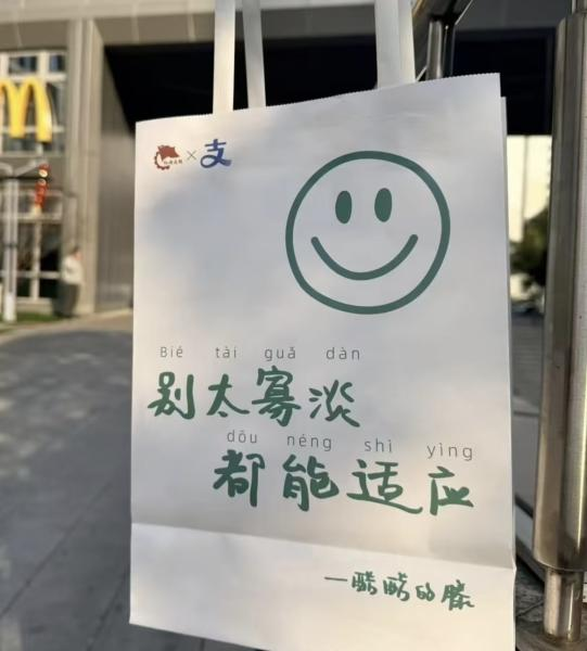 再往前追溯,碰一下袋子给大家提供情绪价值也不是一两天了。 前段时间,支付宝碰一下和四川红旗便利店搞联动,印着酷酷的滕和王天放金句的袋子引得网友四处求代购。你得蹬腿儿,你得扑腾」和「别太寡淡,都能适应」,一跃成为川渝年轻人的时尚单品,拎的不只一个袋子,更是一种态度。