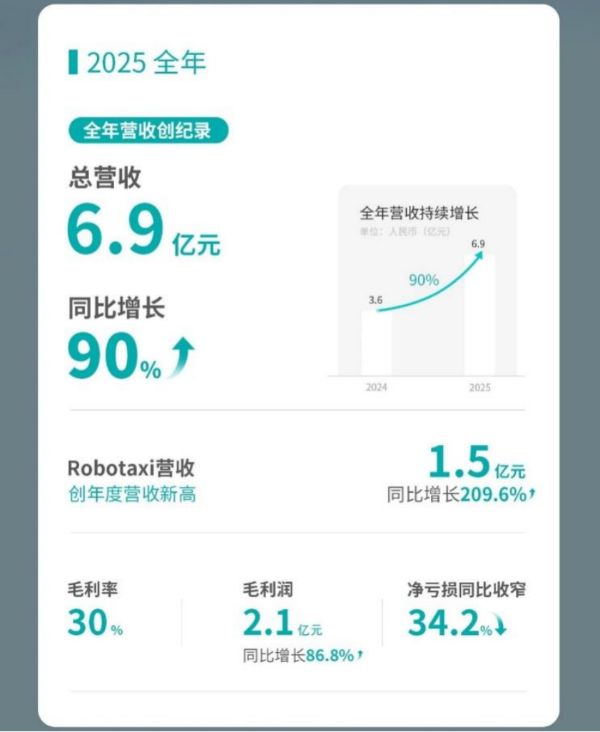 数据显示,2025年小马智行实现总营收6.29亿元,同比增长20%;Robotaxi业务收入达到1.16亿元,同比激增128.6%;乘客车费收入全年增幅接近400%。