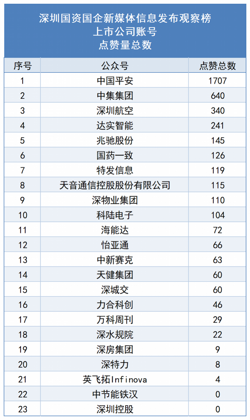 在点赞量维度上,中国平安(1707)较1月增长近两倍,从第四跃居第一;中集集团(640)、深圳航空(340)分列二、三位,但较1月有所回落。点赞量过百的账号共8家,中节能铁汉、深圳控股连续两月为零,深特力(8)、英飞拓Infinova(4)持续低位徘徊。
