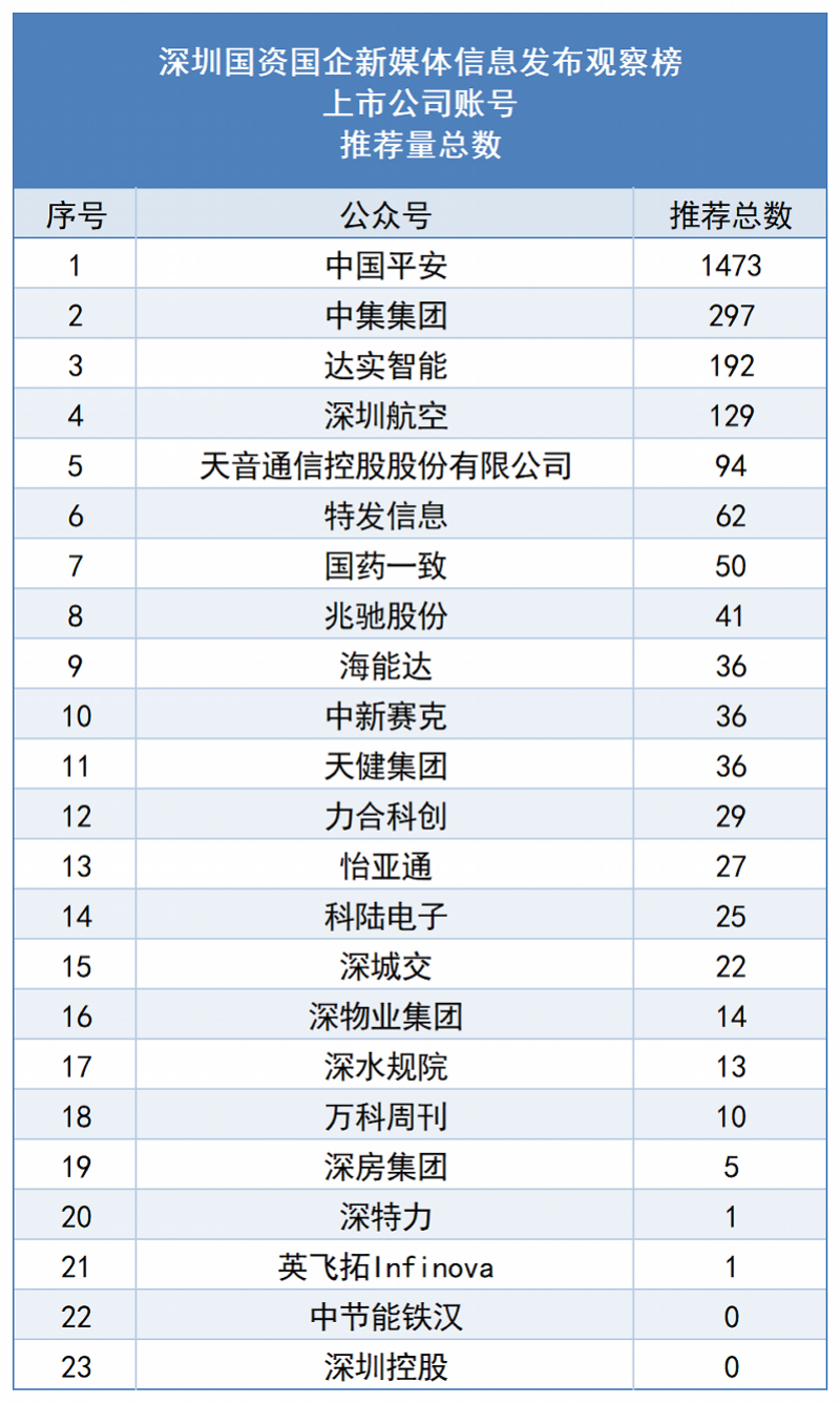 从阅读量维度来看,深圳地铁、深圳市东部公交、国信证券分别以77.4W+、12.4W+、11.9W+的阅读量位于榜单前三位,其中深圳地铁表现尤为突出,其文章《早安,留仙洞!》、《在嘉禾望岗“分手”的朋友,来深圳“翻身”吧!》阅读量突破10W+。深圳市城市公共安全技术研究院、振业阳光招采、特区建发集团分别以1265、472、47阅读量处于榜单后三位。