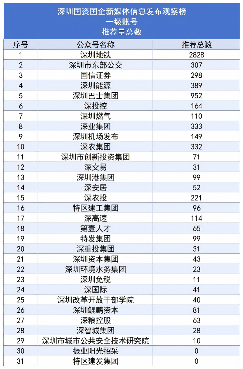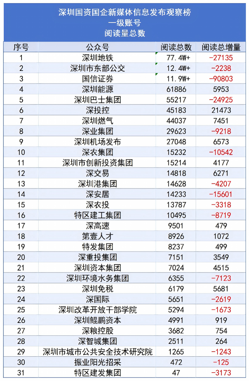 从2022年第一季度起,南都·湾财社对深圳市属国有企业及深圳国资控股或参股的上市公司新媒体的信息发布情况进行测评,以阅读量为主要参考指标观察账号影响力,推出“深圳国资国企新媒体信息发布观察榜”。对深圳国资国企新媒体优秀传播案例进行提炼和分析,总结运营和传播经验,致力于促进深圳国资国企新媒体的蓬勃发展。 本月推出的是“2026年2月深圳国资国企新媒体信息发布观察榜”(简称“深圳国资新媒体信息观察榜”)。测评对象一共有31个深圳国企一级账号,以及23个深圳国资控股或参股的上市公司微信公众号,合计23个账号。其中,31个深圳国企一级账号中,多家公司已上市。