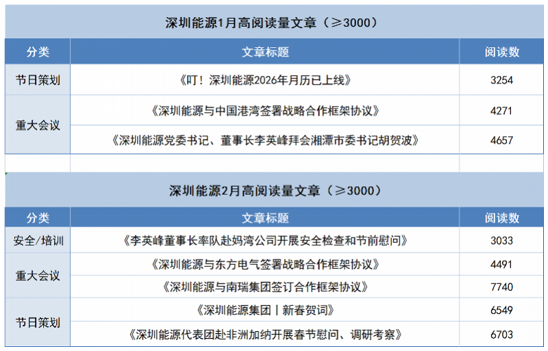 内容结构上,重大会议、战略合作类文章贡献了主要阅读量,这类内容形式正式但阅读稳定,反映出用户对企业重大动态、高层互动等信息的高度关注。同时,春节节点策划成为流量峰值的重要支撑,多篇节日内容阅读量超3000,其中《深圳能源代表团赴非洲加纳开展春节慰问、调研考察》和《深圳能源集团丨新春贺词》分列2月阅读量第二、第三位,将企业温度与节日氛围结合,用户接受度较高。