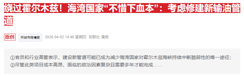 伊朗对霍尔木兹海峡实施无限期控制的威胁,正促使不少海湾国家重新审视成本高昂的输油管道计划,以绕过这一关键海运咽喉要道,从而确保能够继续出口石油和天然气。不过,即使海湾国家建管道也救不了短期的燃眉之急。