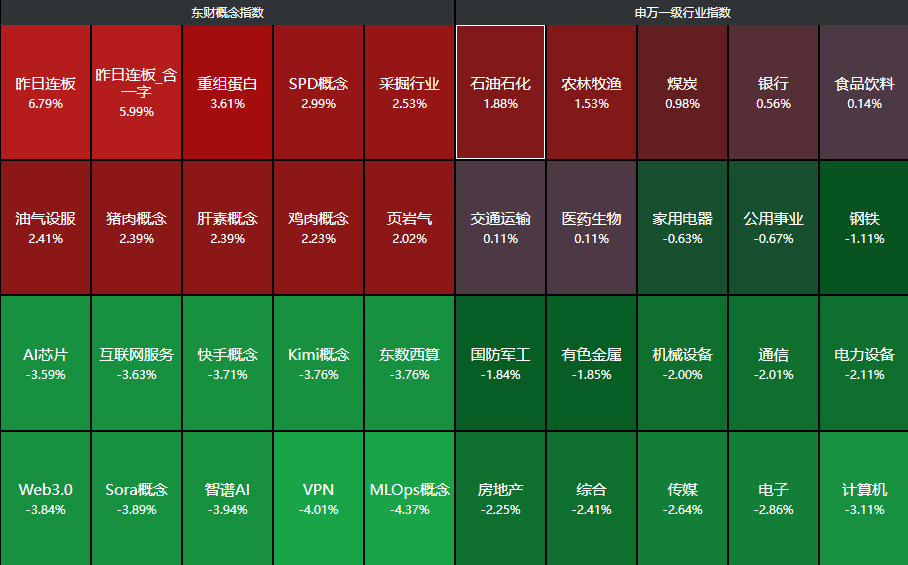 分行业来看,石油石化、农林牧渔、煤炭等行业领涨,计算机、电子、传媒、综合、房地产等行业领跌。