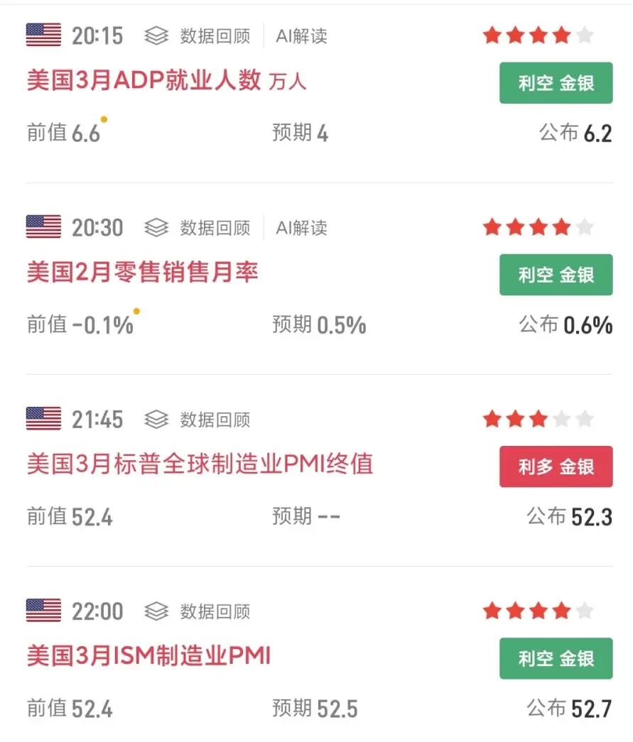 美国3月ADP就业人数增加6.2万人,远超市场预期的4万人。美国2月零售销售环比增长0.6%,超出经济学家预测的0.5%,为2025年7月以来最大增幅;核心零售销售环比增长0.5%,创8个月最高。美国3月制造业PMI升至52.7,创2022年8月以来新高。多方面数据显示,美国经济还是有韧性。