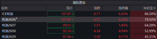 特朗普刚说完,油价爆拉,贵金属跳水,截至发稿,布伦特原油期货涨幅扩大至6.71%,报107.87美元/桶。现货黄金日内跌幅扩大至4%,报4563.85美元/盎司;现货白银向下跌破70美元/盎司,日内下跌6.85%。