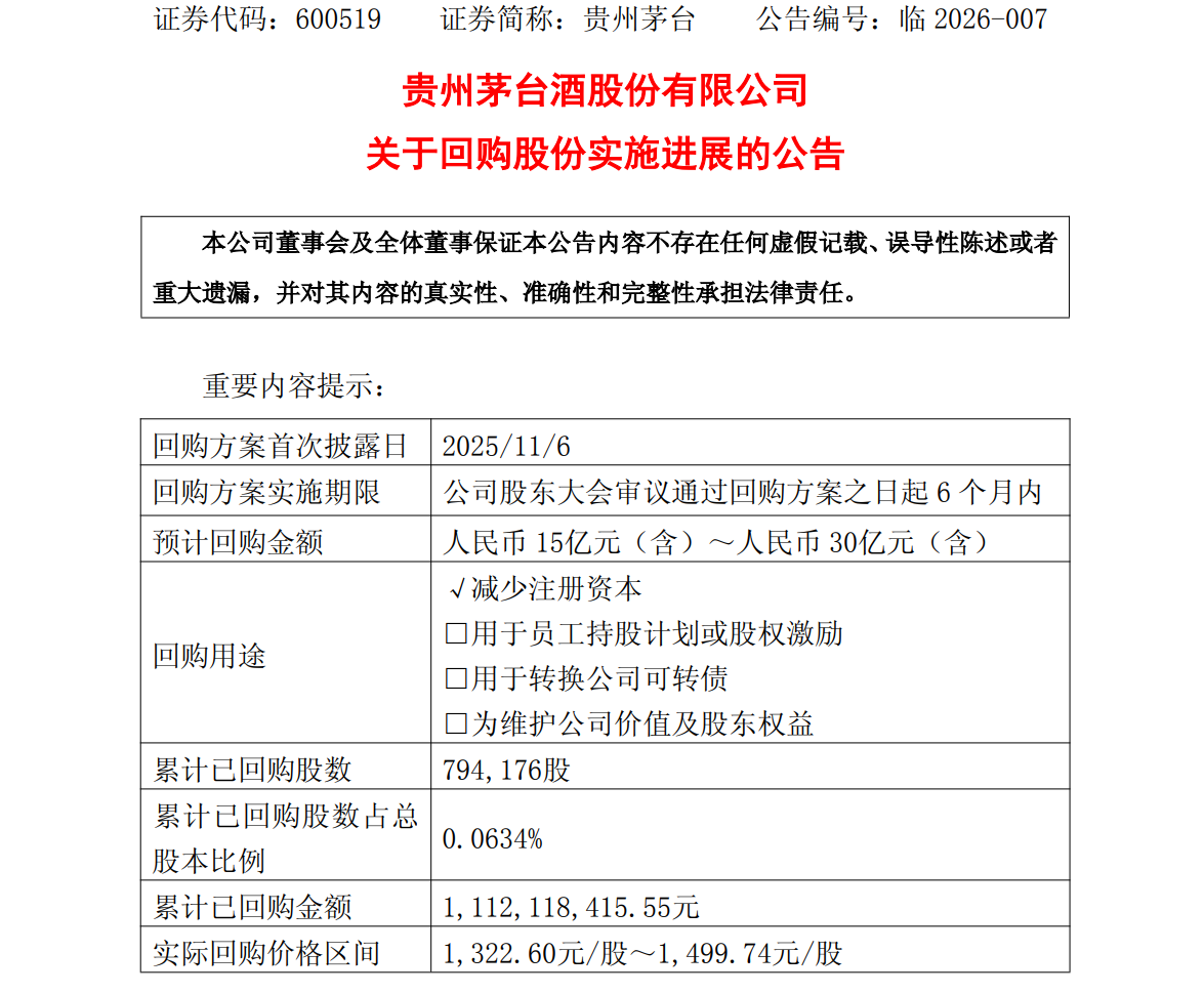 此前,贵州茅台于2025年11月28日召开2025年第一次临时股东大会,审议通过了《关于以集中竞价交易方式回购公司股份的方案》,并于2025年12月25日披露了《关于以集中竞价交易方式回购公司股份的回购报告书》,公司将以自有资金通过集中竞价交易方式回购股份,用于注销并减少注册资本,回购价格不超过1863.67元/股(含),回购金额不低于15亿元(含)且不超过30亿元(含),实施期限为自公司股东大会审议通过回购方案之日起6个月内。