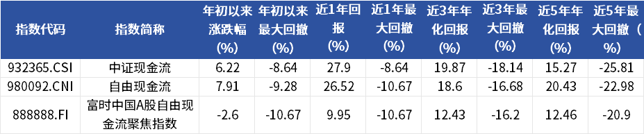 中证全指系列对对现金流的持续性要求很高。要求连续5年经营现金流为正,跟踪该指数目前规模最大的是南方中证全指自由现金流ETF(159232)。