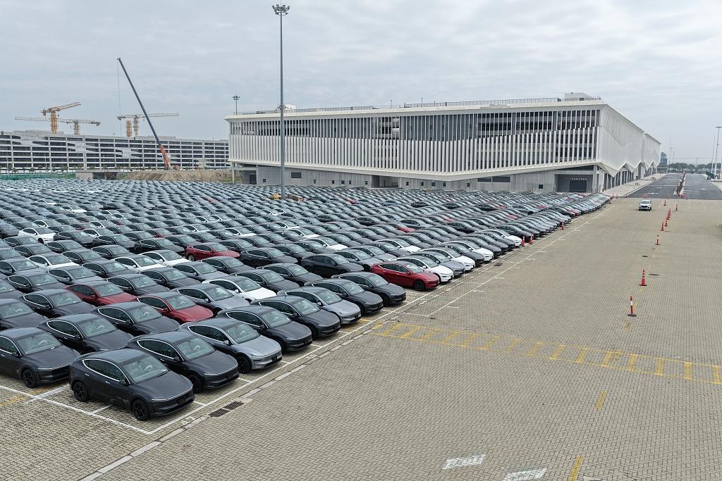 2026年3月22日,上海,特斯拉汽车停放在上海南港码头,即将出口到海外。这些商品车均为由上海超级工厂生产的Model 3和Model Y。视觉中国 图