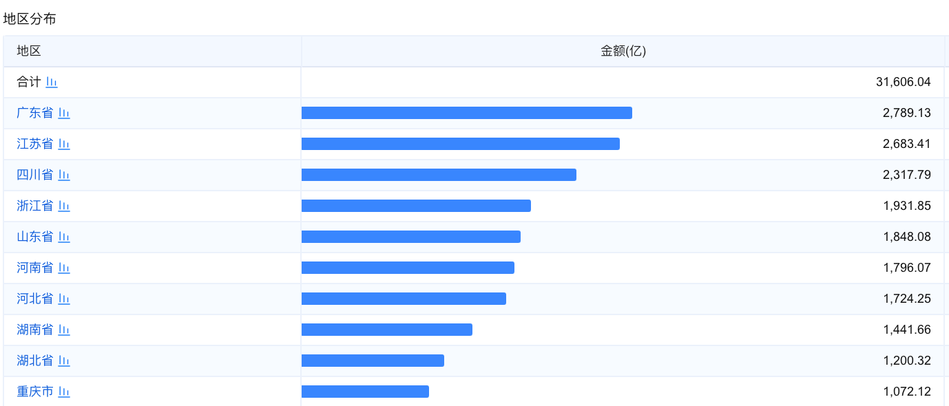 从区域分布看,地方债发行呈现出典型的经济大省领跑格局。一季度发行规模前五的省份分别为广东、江苏、四川、浙江、山东。