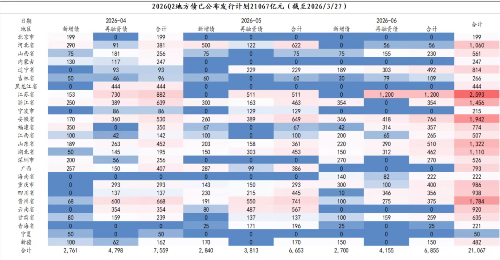 目前,各地已经陆续公布二季度地方债发行计划。据国泰海通证券整理,截至3月27日,26个省份已公布2026年二季度发行计划,合计金额超过2.1万亿元。其中4月7559亿元,5月6653亿元,6月6855亿元。