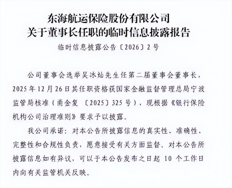 年初,东海保险在官网上发布公告称,公司董事会选举吴冰灿先生任第二届董事会董事长,2025年12月26日其任职资格获国家金融监督管理总局宁波监管局核准(甬金复〔2025〕325号)。