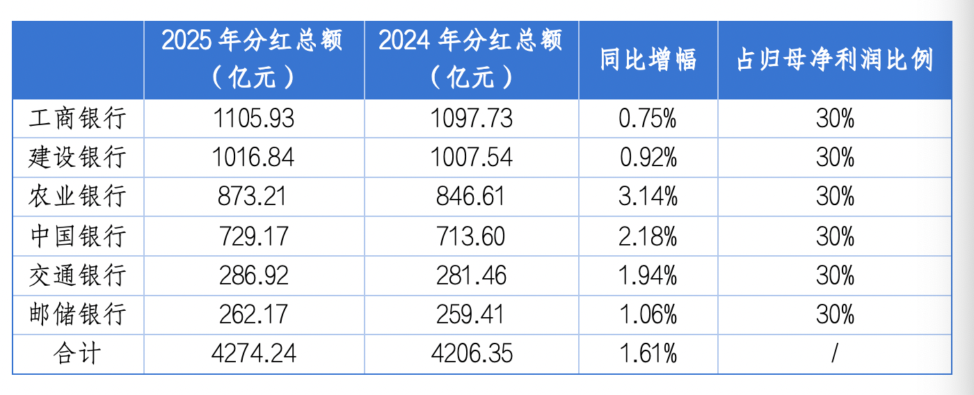 六大国有行2025年度利润分配方案已经悉数出炉,全年分红总额合计达4274.24亿元,较2024年的4206.35亿元增长了1.61%,也是第二次站上4200亿元。