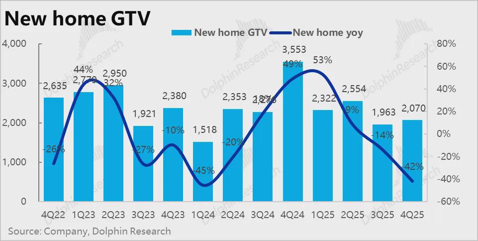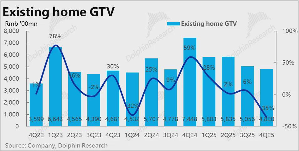 ▲贝壳的存量房(上图)和新房业务交易量情况。图片来自“海豚研究”。