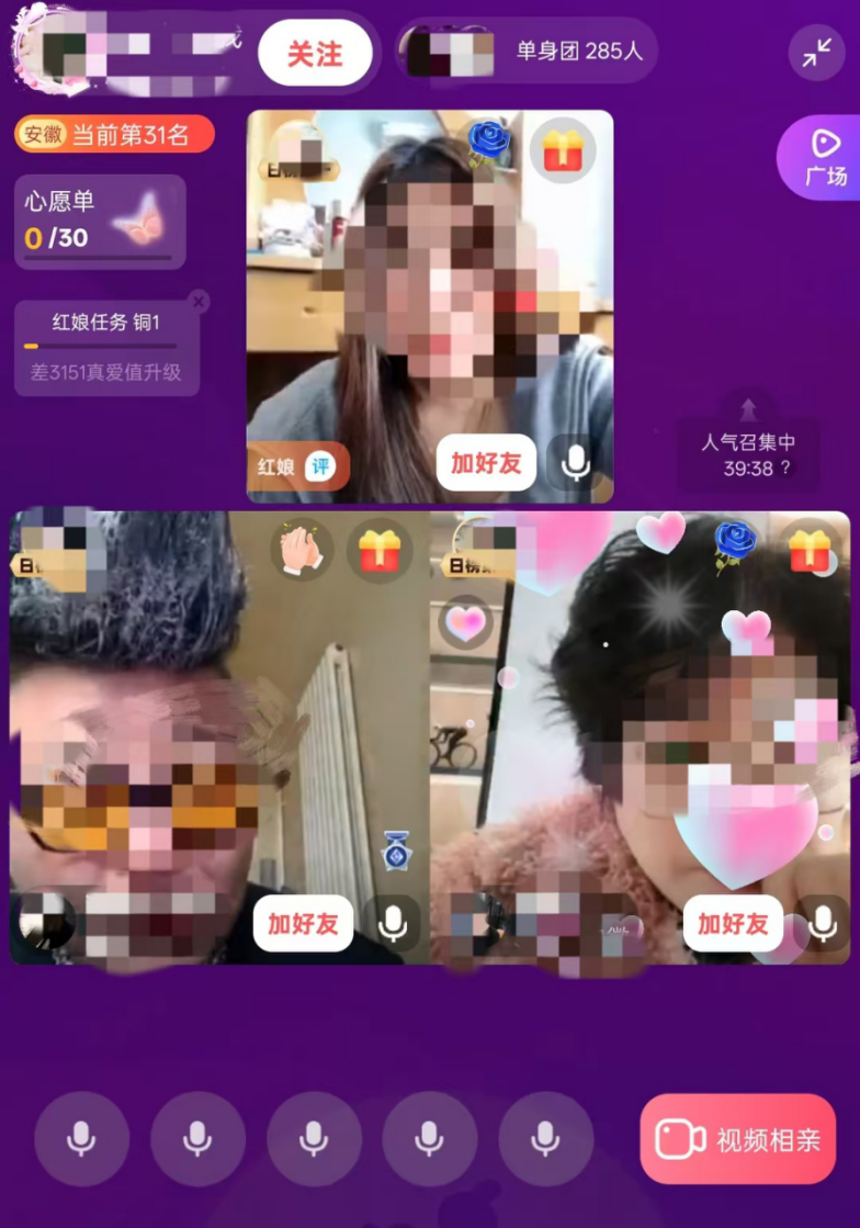 为了解该模式,记者下载了“伊对”App。该应用的slogan为“找对象上伊对”。记者随机点进多个直播间,发现均为三人对话模式,上方的主持人会标有“红娘”字样,下方的两位用户均为异性配置。
