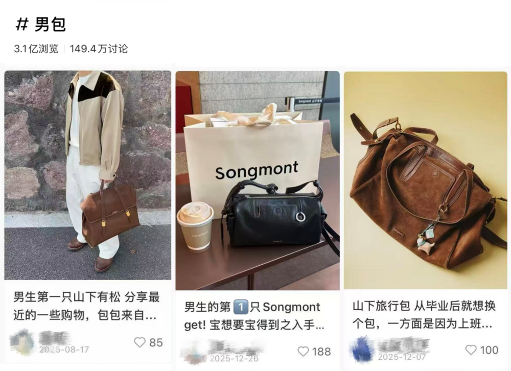 在小红书等社交平台上,#男包的话题达到3亿浏览和149万讨论,不少用户购买Songmont作为自己第一个搭配日常生活的轻奢包,标记为“男生送给自己的第一个包”,重要程度堪比男人的第二张脸。