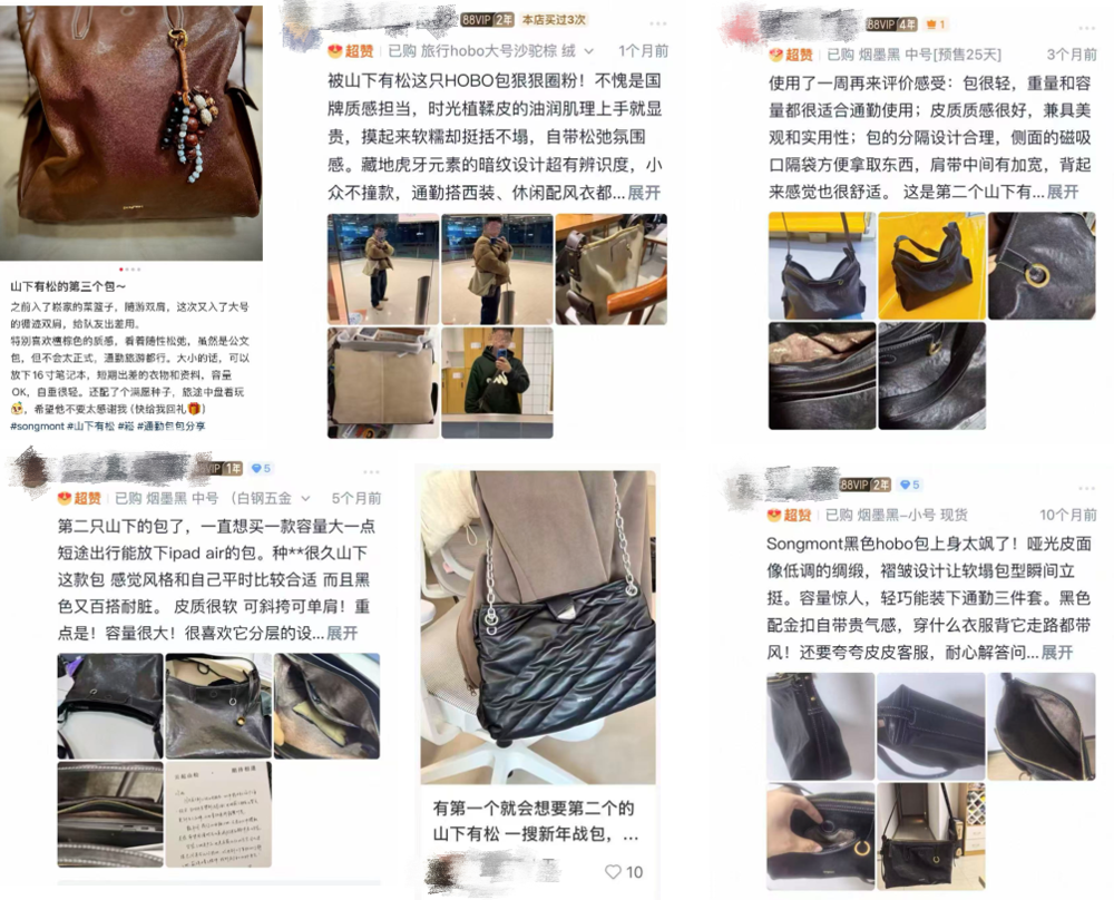 通过社交媒体的用户复购反馈可以看出,消费者不论男女,比起价格和社交属性,都更愿意分享自身的使用感受和Songmont跟自己生活的适配度。