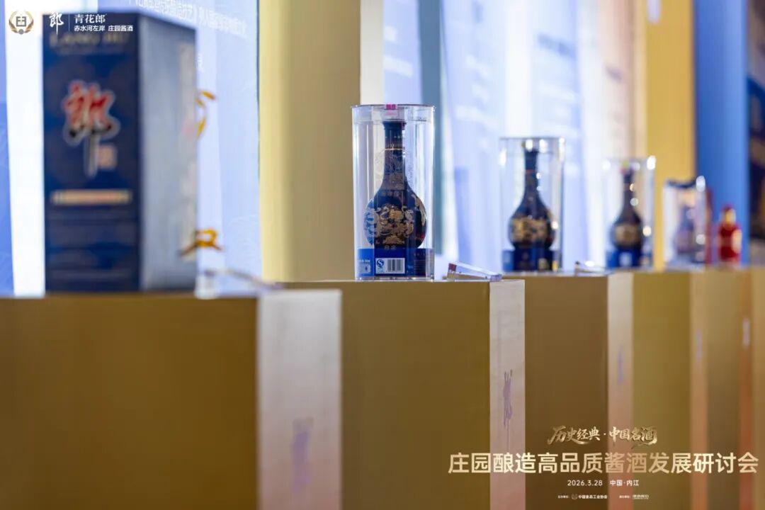 3月28日,四川内江,“历史经典·中国名酒——庄园酿造高品质酱酒发展研讨会”现场,在原第五届全国评酒会专家面前,1984年53°郎酒、1989年53°郎酒、1989年39°郎酒、2025年53°红运郎、青花郎、2025年39°青花郎等多款产品整齐排列。
