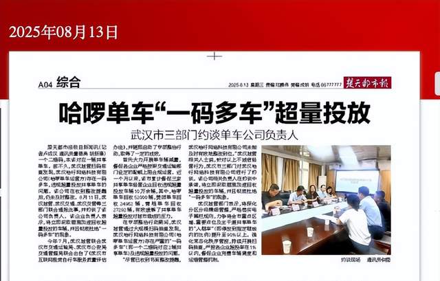 2025年8月,武汉城管、交通、交管三部门联合通报,哈啰单车存在“一码多车”、违规超量投放等问题,并约谈企业负责人。对方承诺立即回收超量车辆,彻底杜绝 “一码多车” 乱象。