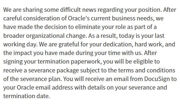 Oracle裁员邮件中最刺痛人的地方,也许并不只是那句“今天就是你的最后一个工作日”。