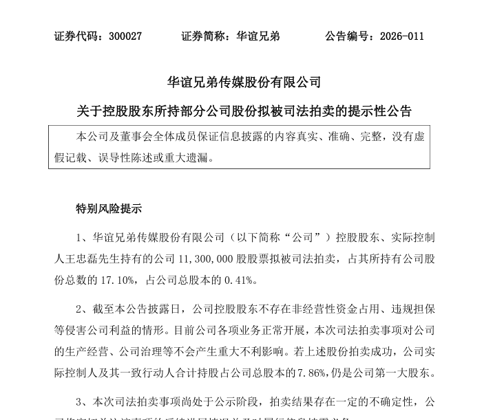 华谊兄弟还表示,目前,公司各项业务正常开展,此次司法拍卖事项对公司的生产经营、公司治理等不会产生重大不利影响。若上述股份拍卖成功,公司实际控制人及其一致行动人合计持股占公司总股本的7.86%,仍是公司第一大股东。