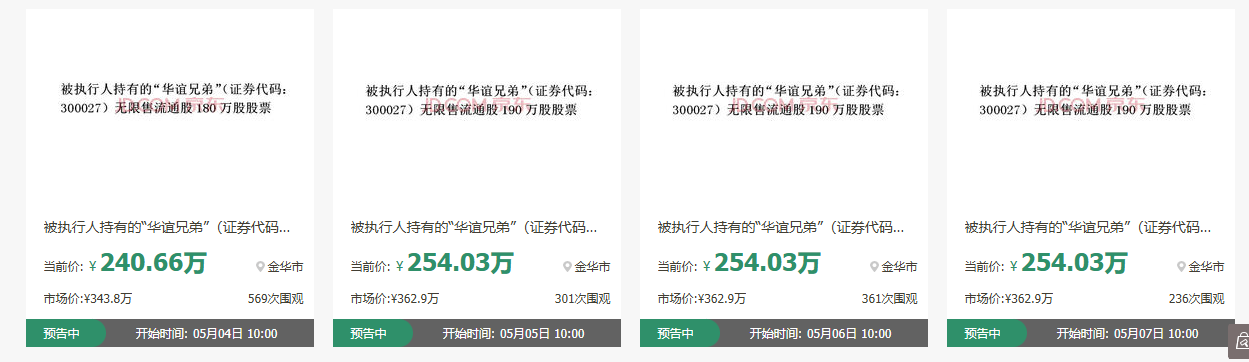 红星资本局在京东资产交易平台查询发现,目前,这些股票已在该平台上架,分为六个拍品,起拍价从241万元至254万元不等,拍卖时间分别为5月4日至5月9日的上午10时。