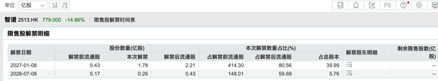 据Wind数据显示,共计2568.16万股,占总股本5.76%,至7月8日解禁。按 915 港元计算,解禁市值约235 亿港元,相当于当前真实流通市值的2.2 倍。此外,共计1.78亿股,占总股本39.99%,至2027年1月8日解禁。