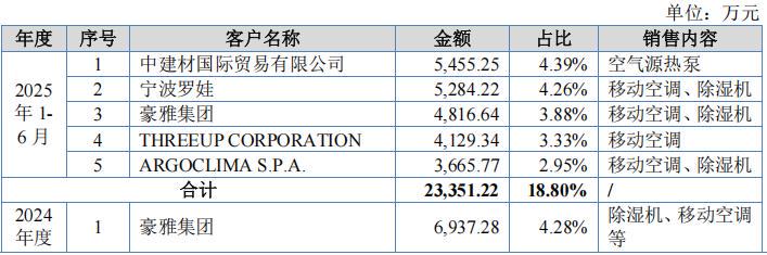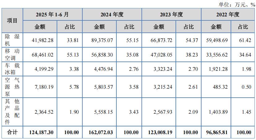 2023年至2025年1-6月,公司主营业务收入分别同比增长26.99%、31.76%、38.68%,主要是移动空调和除湿机销售量持续增长,同时公司推出车载冰箱和空气源热泵两大新兴产品并实现大幅增长。