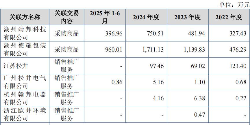 报告期内,欧伦电气对湖州德耀包装有限公司采购纸箱、纸底托等包材,采购额分别为476.29万元、1139.83万元、1711.13万元、960.01万元,该公司由实控人陈先勇侄子陈杰之表姨王军丽曾控制的企业。德耀包装成立于2021年8月26日,注册资本为300万元,王军丽在2022年11月成为该公司股东,持股比例50%,陈杰持股比例30%,后者在2023年7月退股;2024年11月,王军丽、陈友明、王洪山均退股,退股前持股比例分别为50%、30%、20%。
